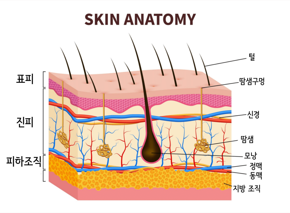 진피 : 피부 90%로 진짜 피부, 표피에 영양 공급
